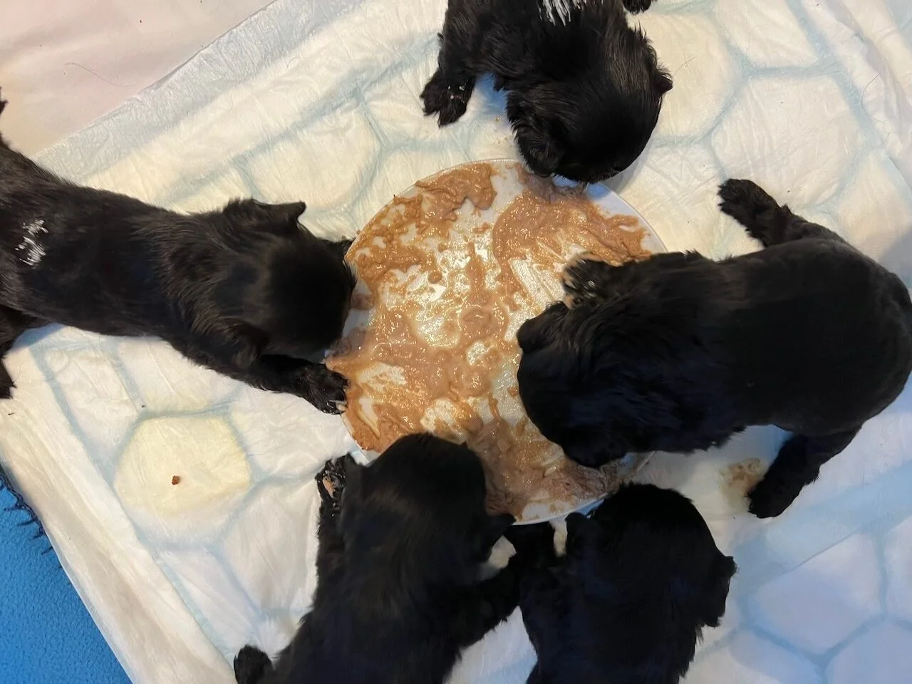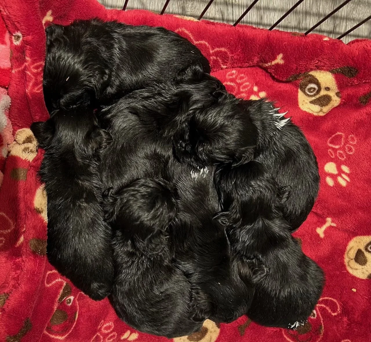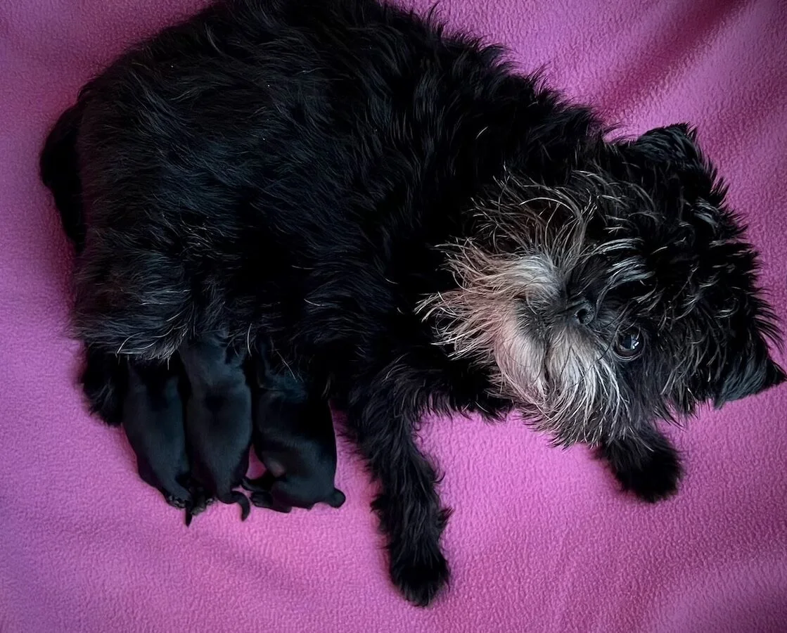 Mother with her newborns. At this stage, other dogs are not welcome, and only the owner is permitted to handle the puppies.